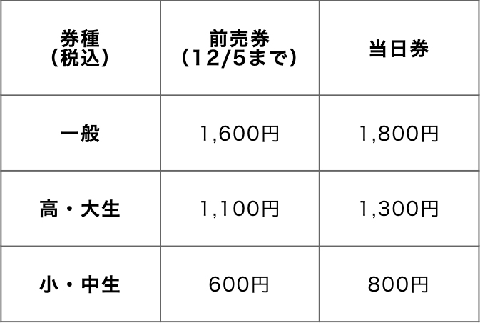 - ※前売券および日時指定券は会場窓口では販売いたしません。ただし、日時指定券は販売残数がある場合、当日会場窓口で販売いたします。