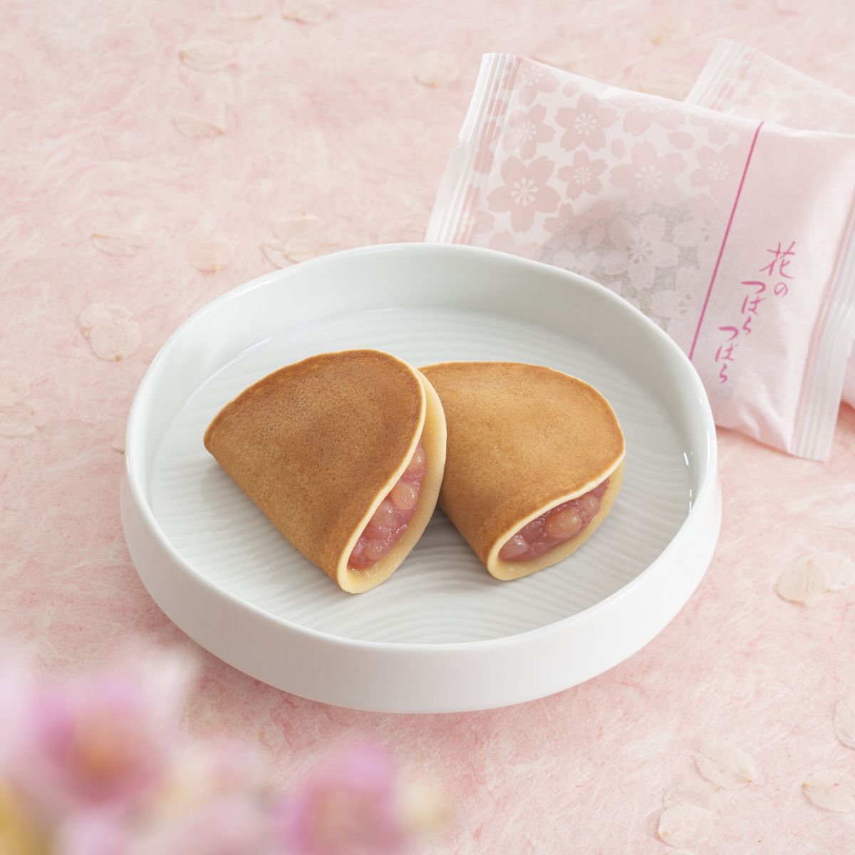 桜色に染めた備中白小豆製の粒あんをもっちり、しっとり食感の焼皮でつつみました。