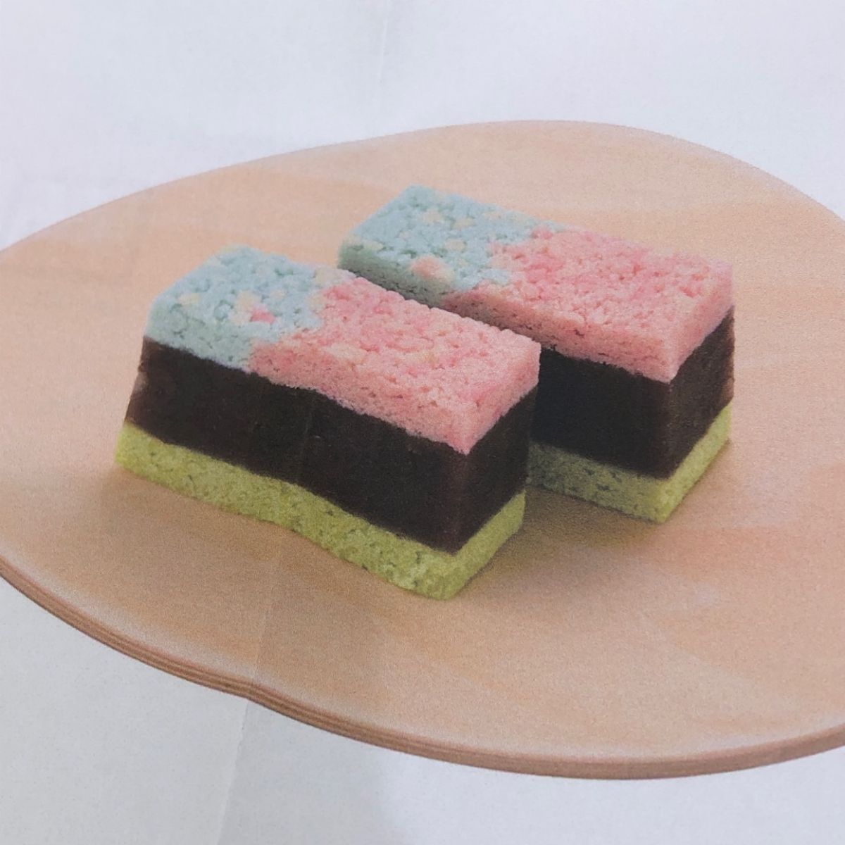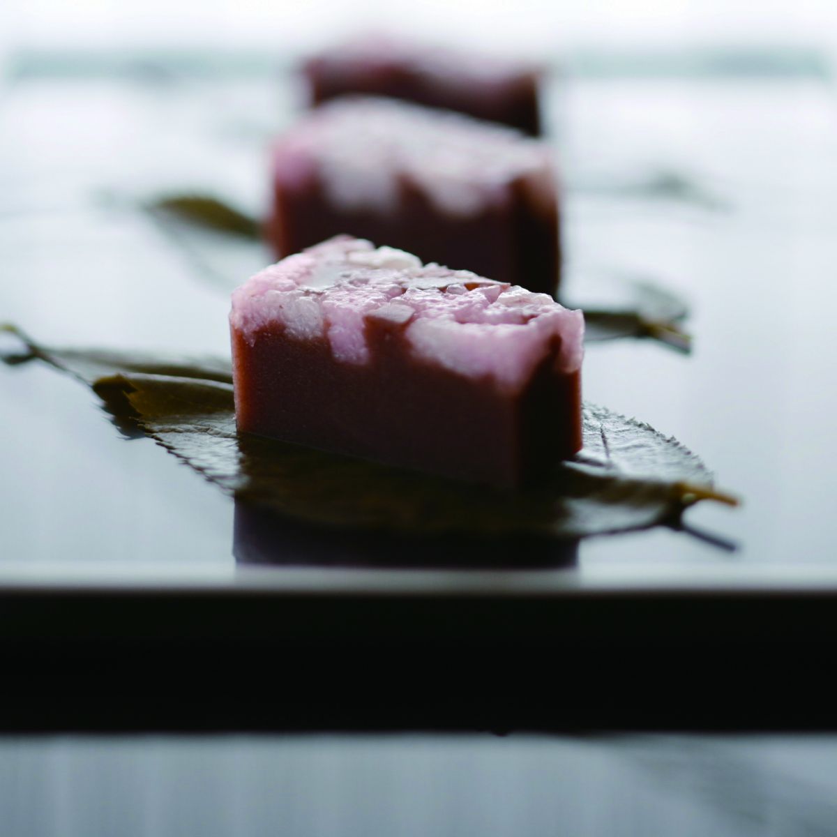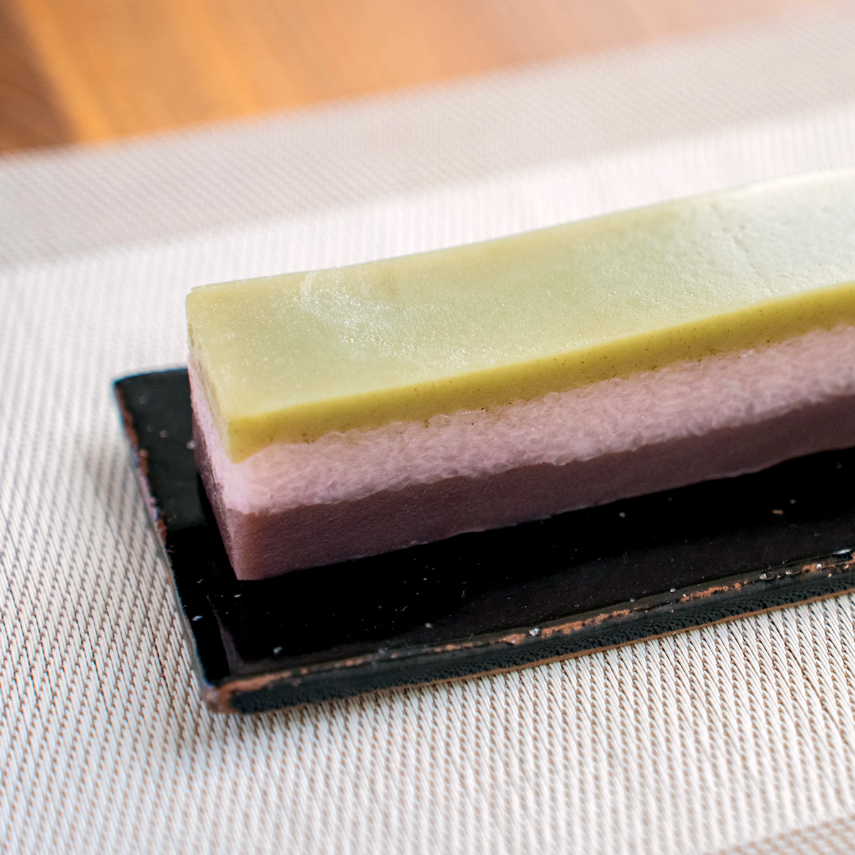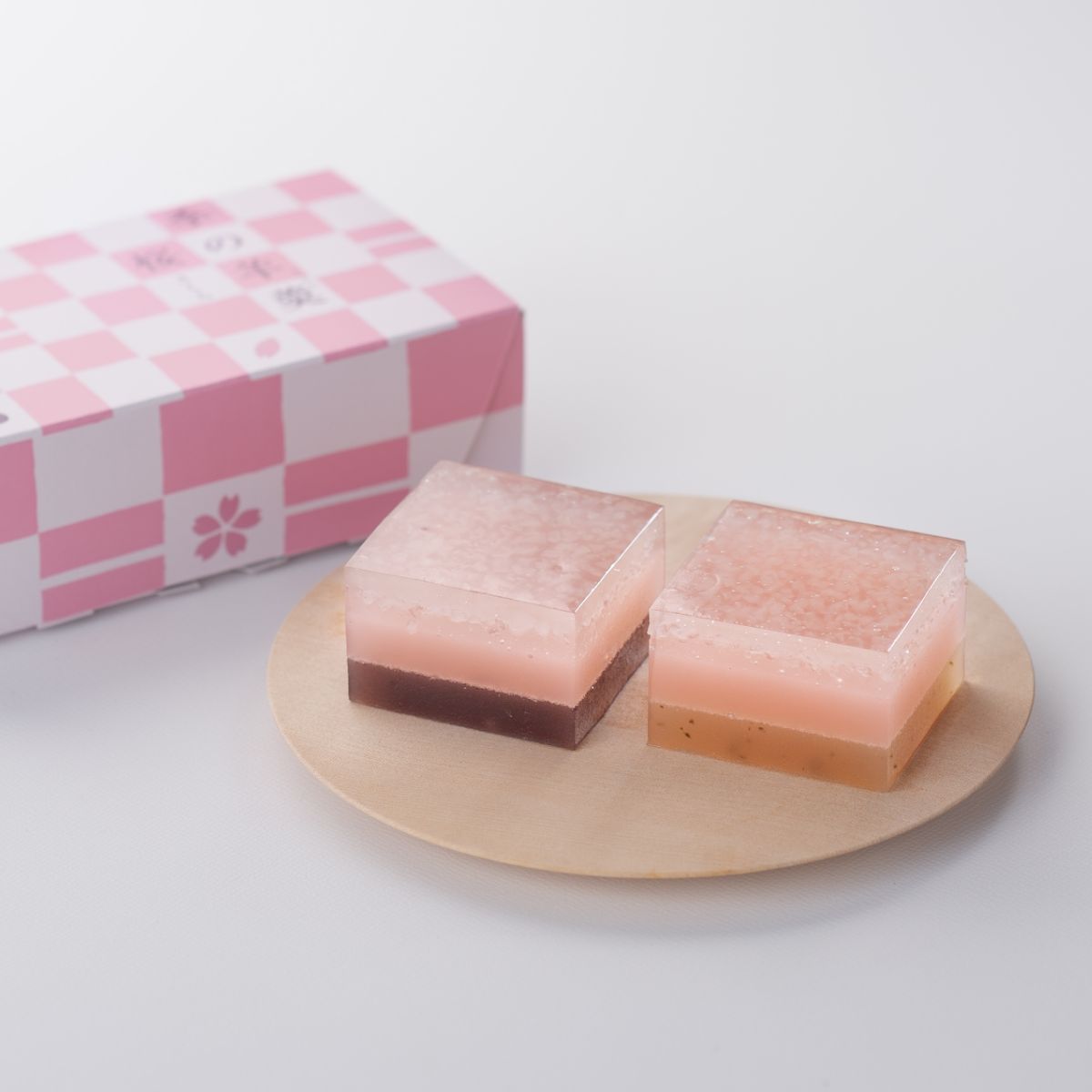 桜葉を練り込んだ、こし餡と白餡の羊羹の上に、道明寺をちりばめた羊羹を重ねました。