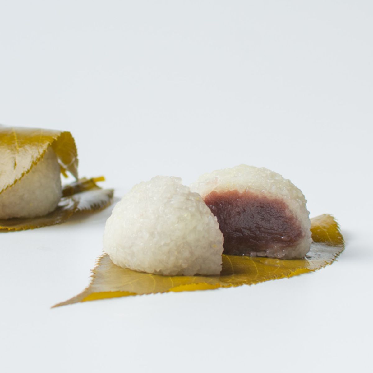 道明寺でこしあんを包み、2枚の塩漬け桜葉ではさみました。