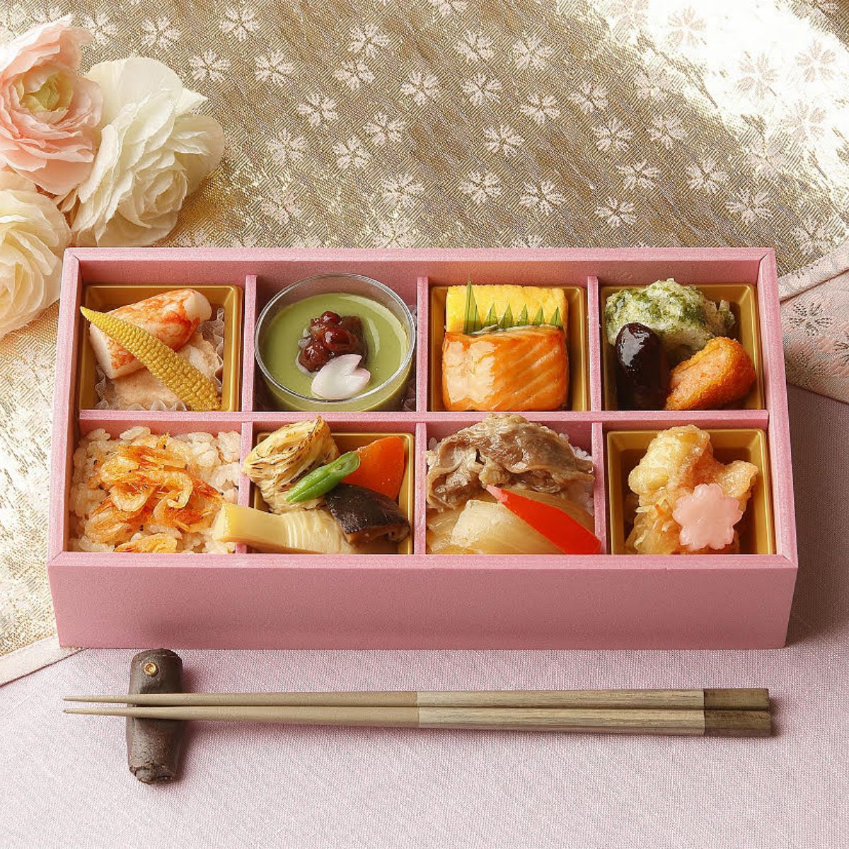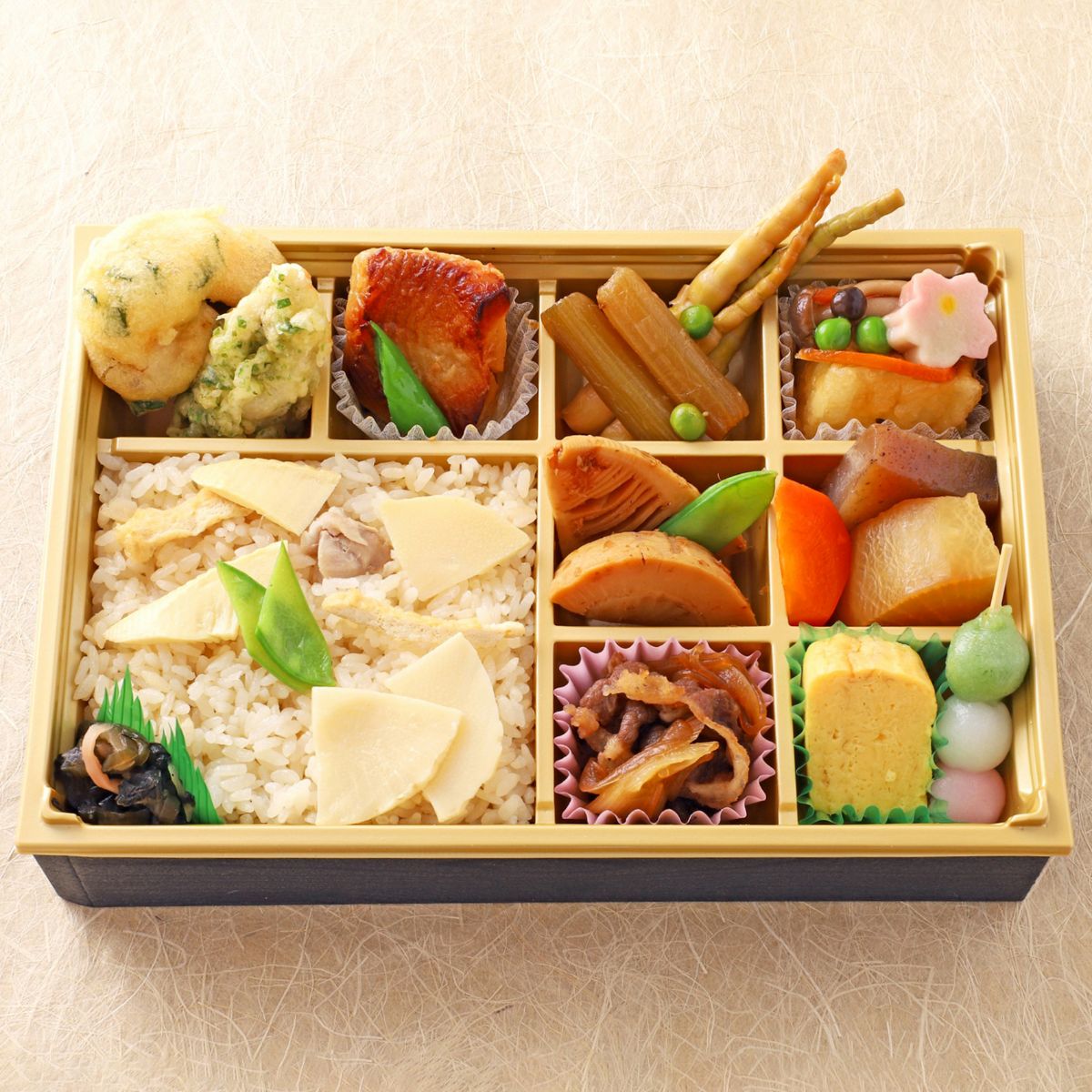 柿安定番のオールスター弁当・春らしさを感じられる限定バージョンでご用意しました。