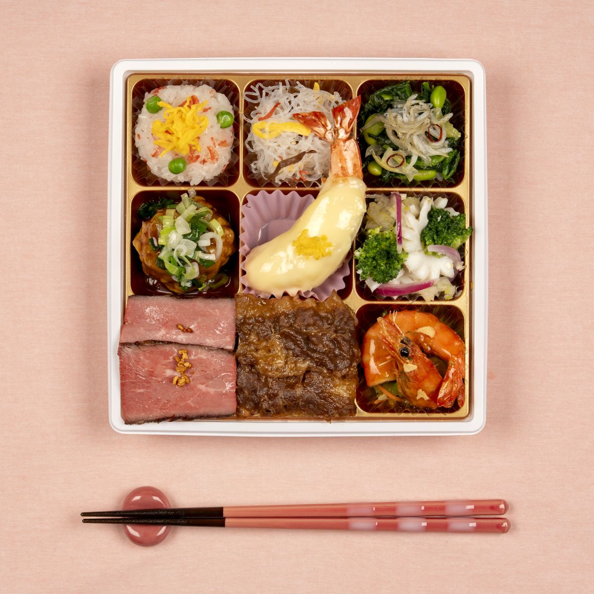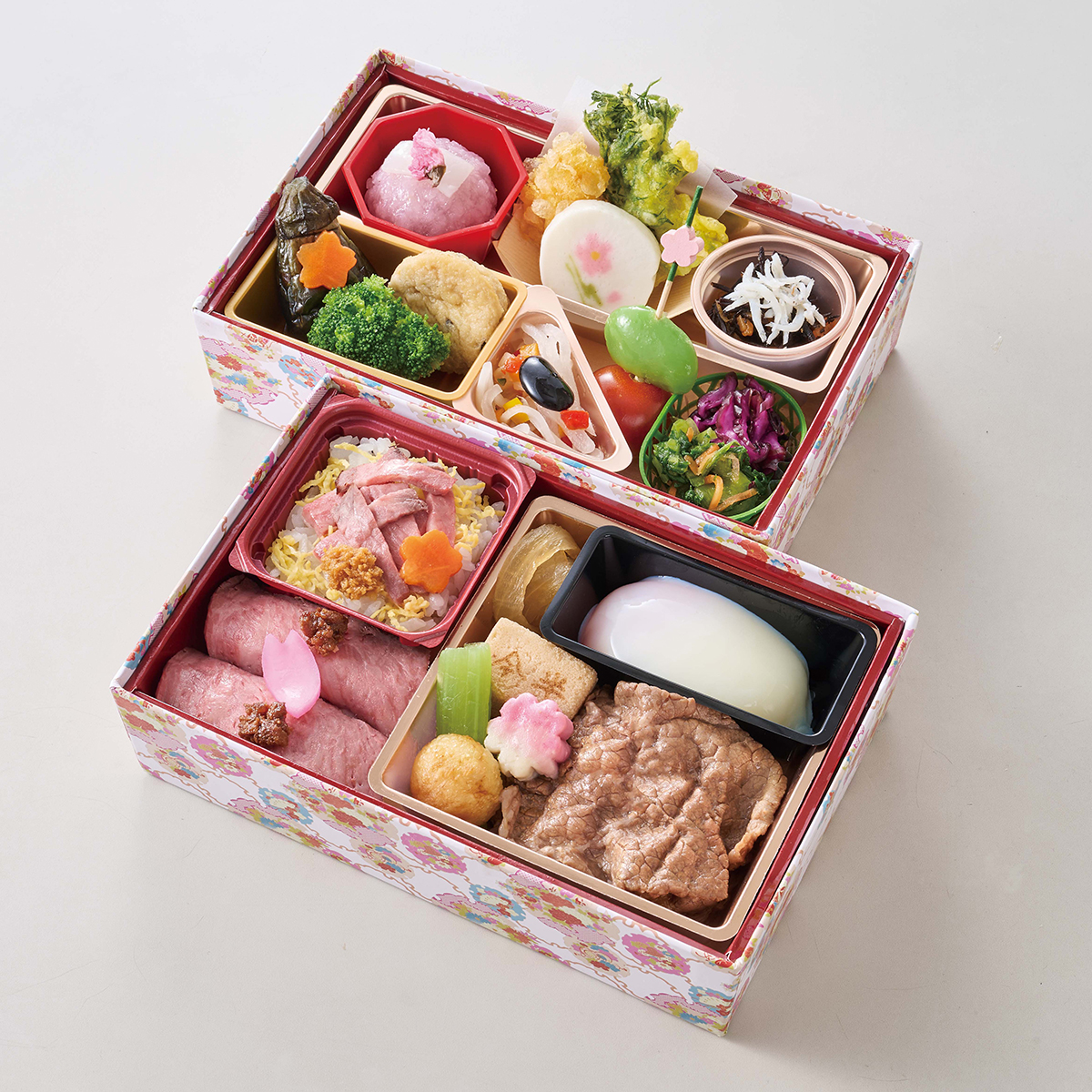 黒毛和牛づくしの贅沢な旨みと、春の彩りを詰め合わせた季節限定の特製二段重です。