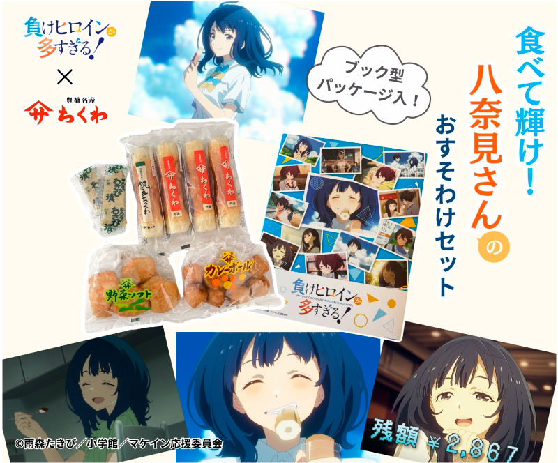 アニメ「負けヒロインが多すぎる!」にも登場するちくわや、こだわりの商品を詰合せました。原作のライトノベルにちなんだブック型のオリジナルパッケージです。