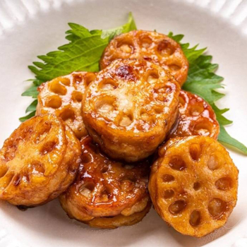 自家製の漬けダレにつけた唐揚げを蓮根で挟み揚げています。油っこくない自慢の唐揚げを是非ご賞味ください。