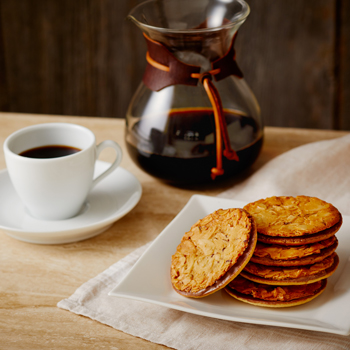 ヘーゼルナッツとアーモンドをふんだんに使用した"パリッ"とした「チュイールクッキー」。生地にアーモンドパウダーを混ぜ込んだ"ザクザク"の薄焼きクッキー。2種類の食感異なるクッキーで、ミルクチョコレートをサンドしました。