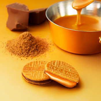 口どけのよいミルクチョコレートで、生クリームと黒糖でとろとろに炊き上げたキャラメルを包み込み、 オリジナルの焼印をつけたバターたっぷりの香ばしいクッキーでサンドしました。お口の中でクッキー、チョコレート、キャラメルそれぞれが一度ほどけ、再び絶妙なハーモニーを醸し出します。