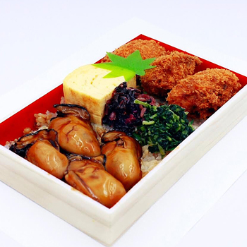 牡蠣飯の上に瀬戸内海ですくすく育ったぷりっぷりの煮牡蠣と肉厚なカキフライがのった弁当です。