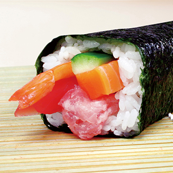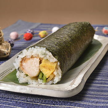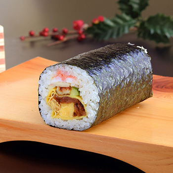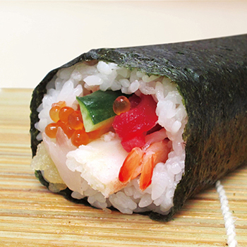 - 6種類の海鮮(いか・サーモン・えび・ししゃも卵・まぐろたたき・数の子)と玉子、きゅうりを巻いた恵方巻です。