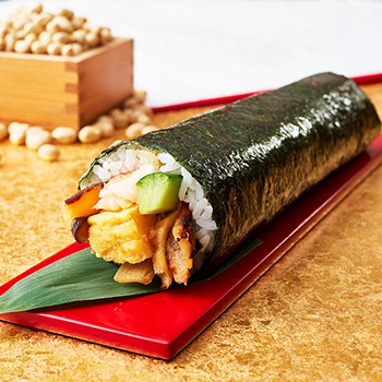 - うなぎのたれご飯に国産うなぎと厚焼き玉子をたっぷり巻き込んだ恵方巻。甘酢生姜と大葉が良いアクセントになっています。