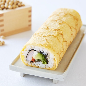 - クリームチーズが味のポイント。甘みのある薄焼き玉子で包んだサラダ恵方巻きです。