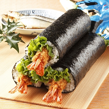 - ぷりっぷりの大きな海老フライを恵方巻にしました。グリーンリーフとタルタルソースでサラダ風に。お子様にもおすすめです!