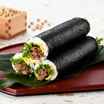 - まつおか人気の国産牛しぐれ煮に椎茸の旨みを加えて恵方巻に。グリーンリーフと薄焼玉子で彩り良く仕上げました。