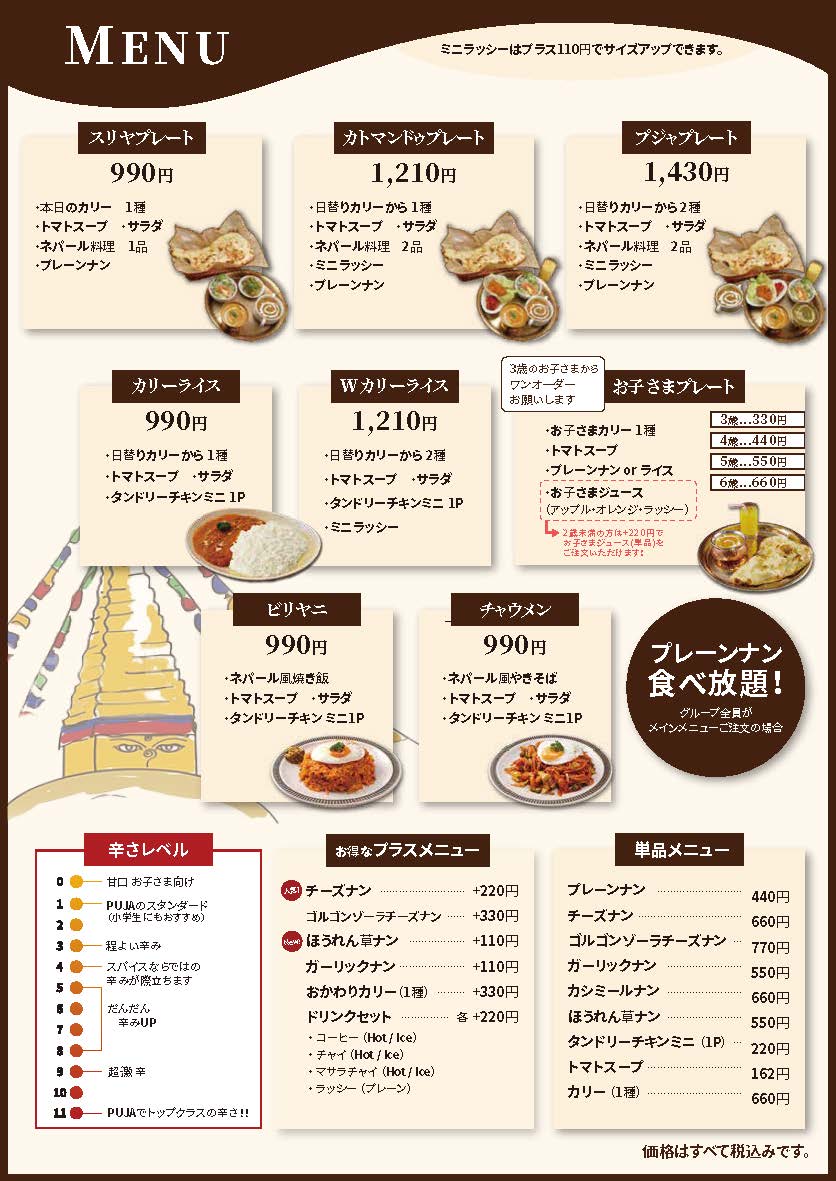 ネパール語で「PUJA」とは「お祈り」という意味を持ちます。カトマンドゥカリー プジャではカリーを通じて皆様に幸せになってほしいという「祈り」をこめて、本国で腕を磨いたネパール人シェフが50種類以上のスパイスやハーブを使用して創りあげる、本場の味と日本の味覚を融合させたカトマンドゥカリーを味わっていただけます。