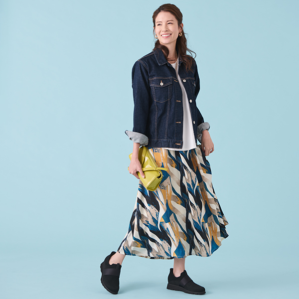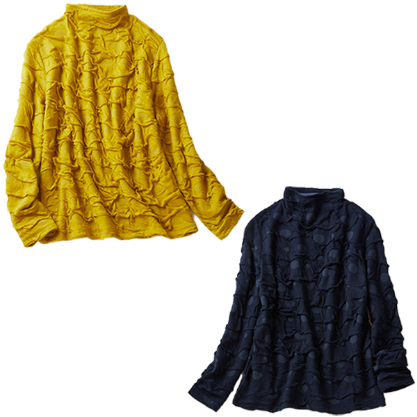 ふっくらとした凹凸感とさりげない水玉模様。ほんの少しの光沢が、上品な大人らしさを演出。裏側は、やわらかな質感が気持ちいい綿。伸縮素材でラクなうえ、表情豊かな生地は、体形カバーにも効果的。