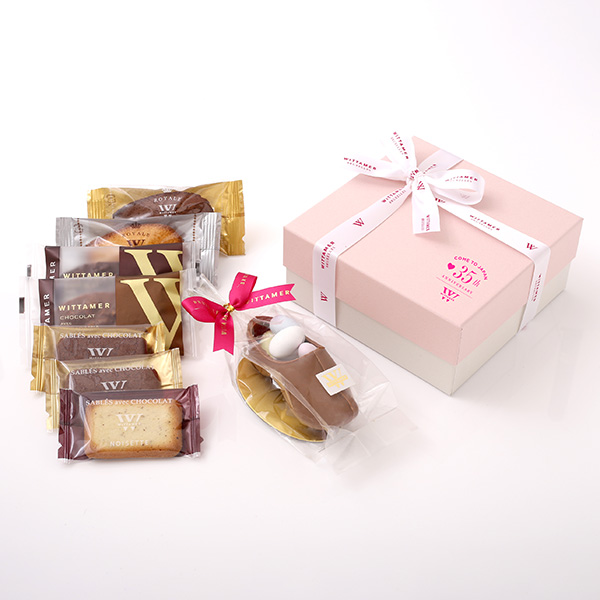 ヴィタメールで人気の焼菓子「マカダミア・ショコラ」や「ロイヤル・マドレーヌ」、ドラジェ入りの型チョコレートを詰め合わせた35周年記念の限定BOX。