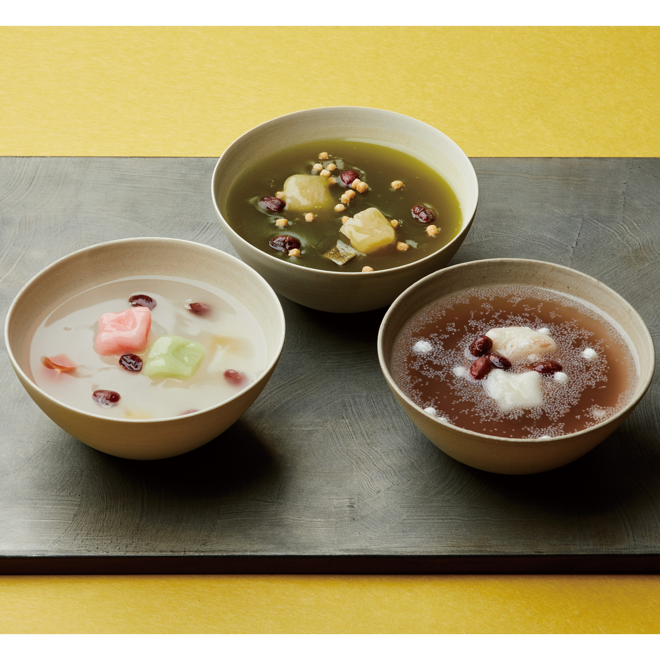 熱湯を注いですぐ出来上がる3種の風味。色とりどりのお餅や羊羹が美しい「みつ豆くず湯」、小豆とお餅のさらりとした「風流しるこ」、香り高い抹茶の甘みとあられの香ばしさが絶妙な「挽茶あられ」。
