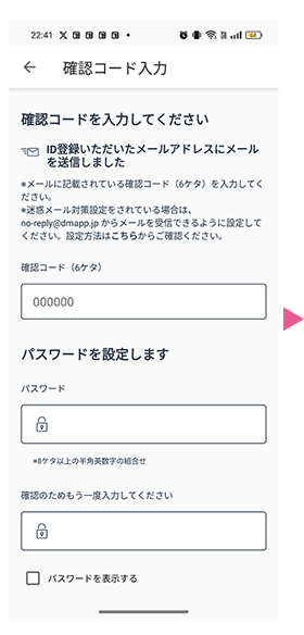 ❸メールに届いた「確認コード」と「パスワード」を入力。