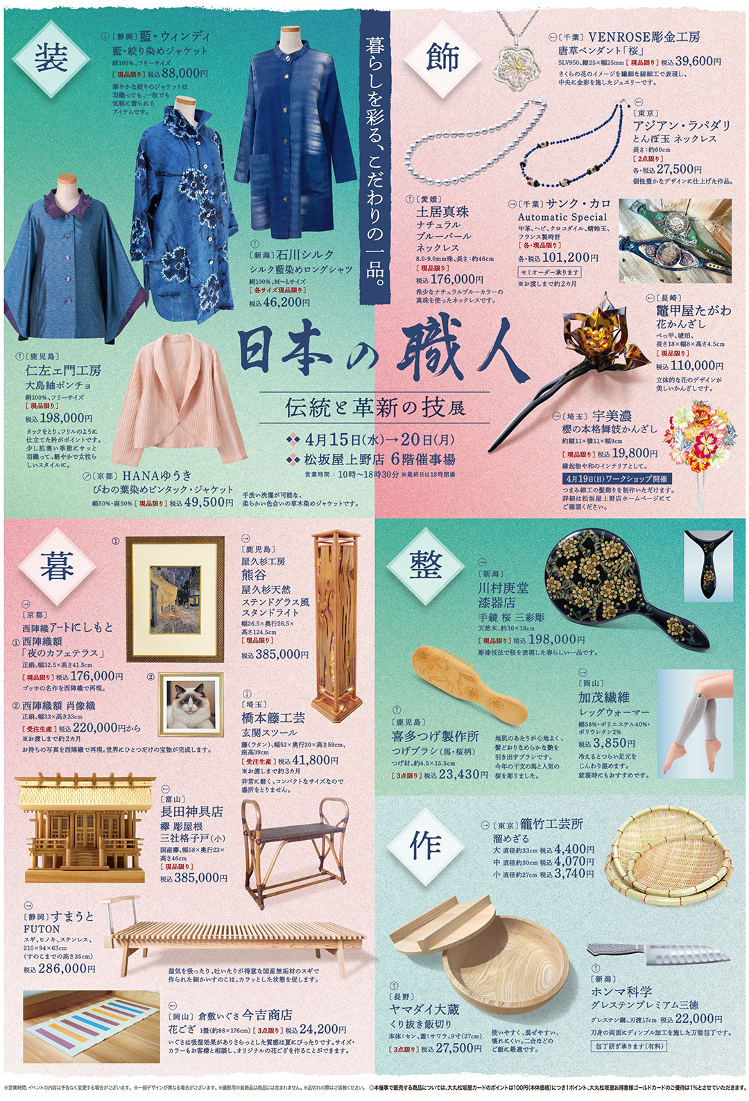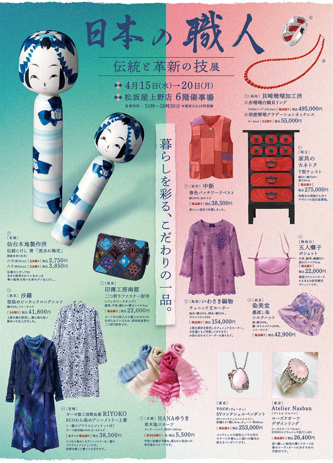初日4月15日(水)の「日本の職人 伝統と革新の技 展」 仙台木地製作所【伝統こけし】販売に伴う早期入場の詳細はこちらから>>4月19日(日)には、〈宇美濃〉「つまみ細工髪飾り製作体験」を開催。ご予約ページはこちらから>>