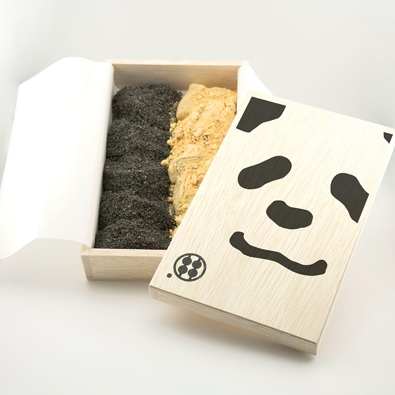 パンダ桐箱双子バージョンとして、きな粉と黒ごまのわらび餅の組み合わせでお詰めします。