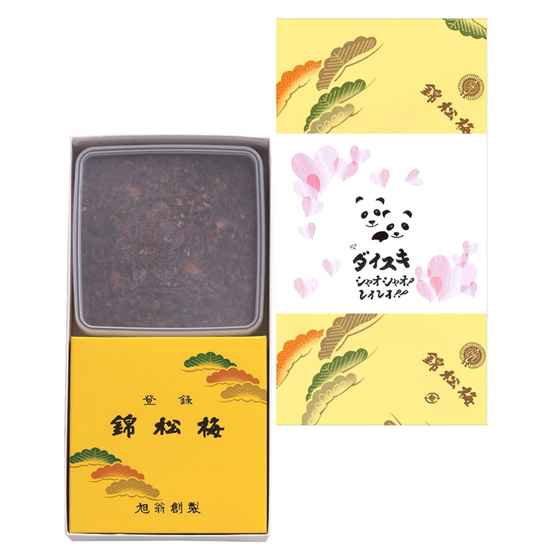 双子パンダをイメージした2個入りプラスチック容器(2個入)に錦松梅オリジナルのパンダ掛け紙を掛けました。