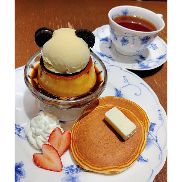 パンダプリンとミニホットケーキとドリンクのセットです。