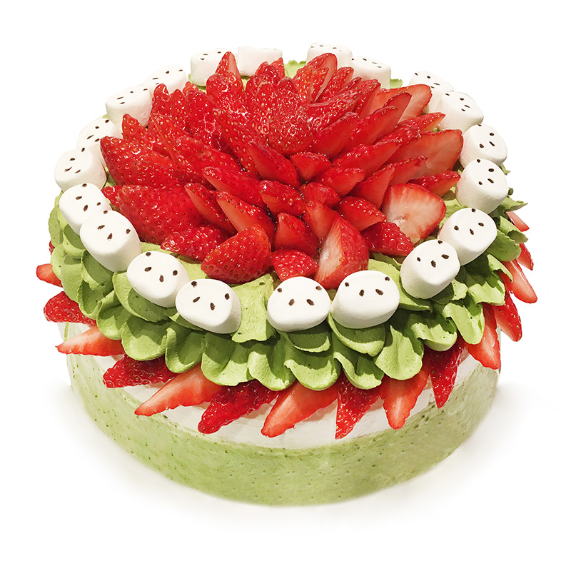 いちごと洋梨を使用し、かわいいマシュマロパンダを飾ったショートケーキです。