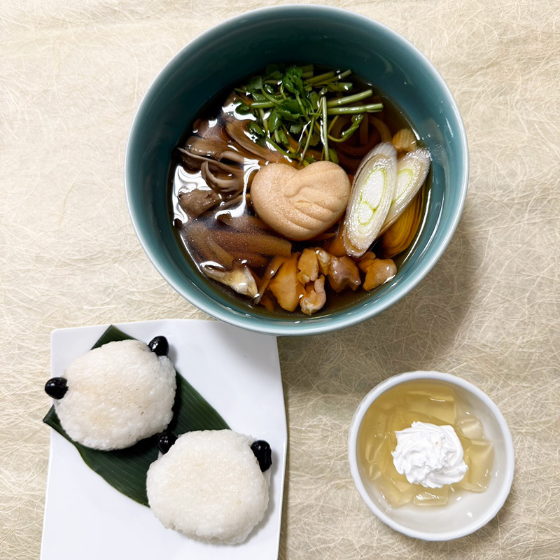 パンダの塩むすびをハート型のもなかを浮かべたおつゆに入れてお召しあがりください。